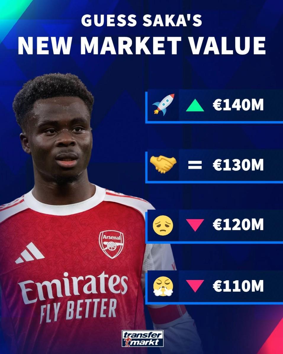开云体育网址-德转预热萨卡身价更新:最高涨至1.4亿欧,最低降至1.1亿